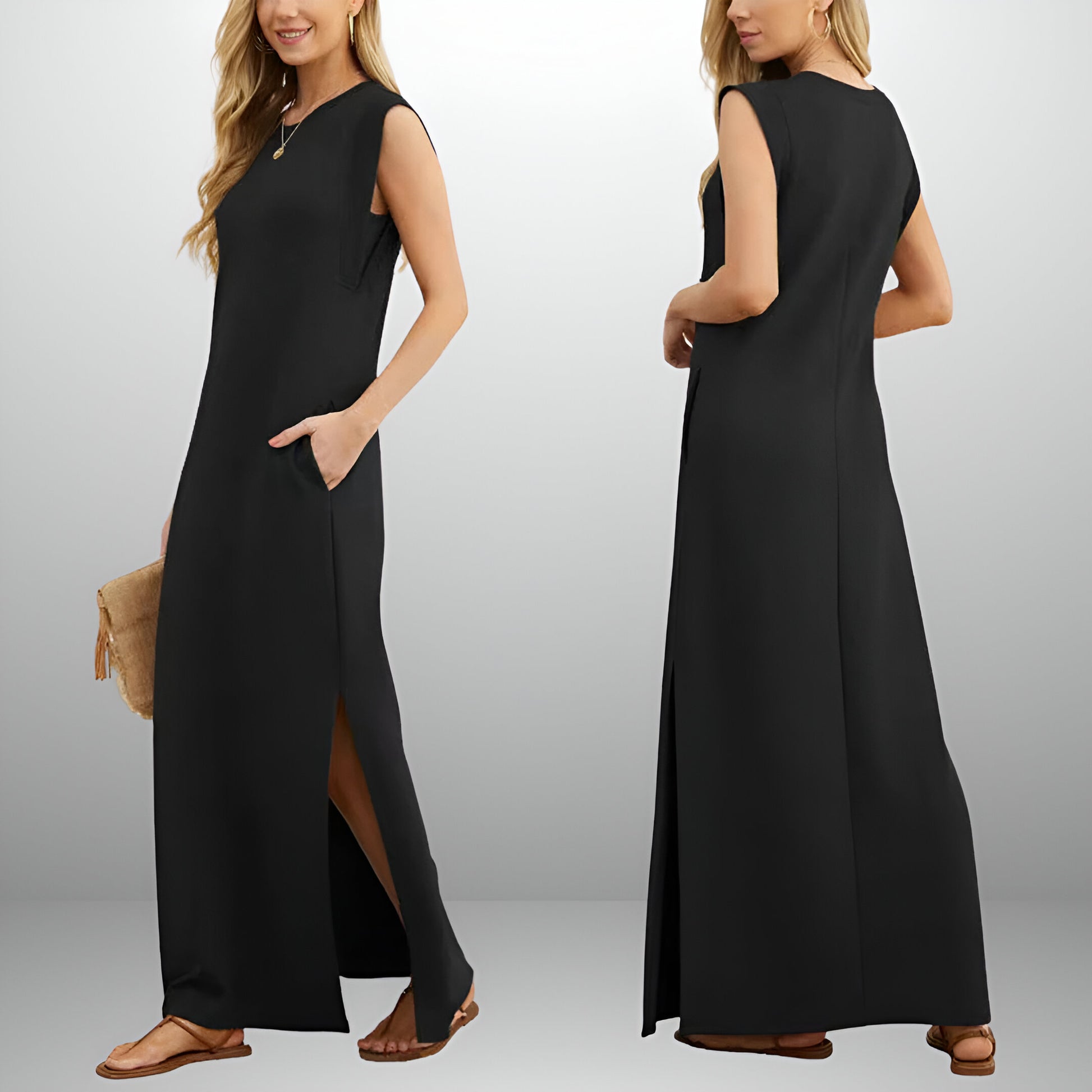 Voeg een vleugje klasse toe aan je zomergarderobe met de Emma™ | Lange Jurk met split. Deze stijlvolle en comfortabele jurk is ontworpen voor zorgeloze dagen en zwoele avonden. De ronde hals en mouwloze snit houden je koel, terwijl het vloeiende silhouet ultiem comfort biedt.