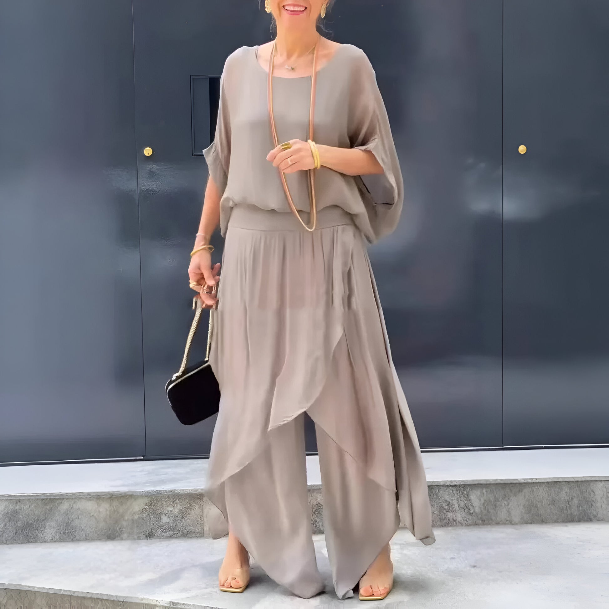 Luchtig, losvallend en moeiteloos vrouwelijk – de Eyla™ set is jouw ultieme outfit voor elke zomerse gelegenheid. De onregelmatige brede pantalon gecombineerd met het flowy topje en batwing-mouwen zorgt voor een verfijnde, maar nonchalante look. Perfect voor warme dagen waarop je er chic uit wilt zien zonder in te leveren op comfort.