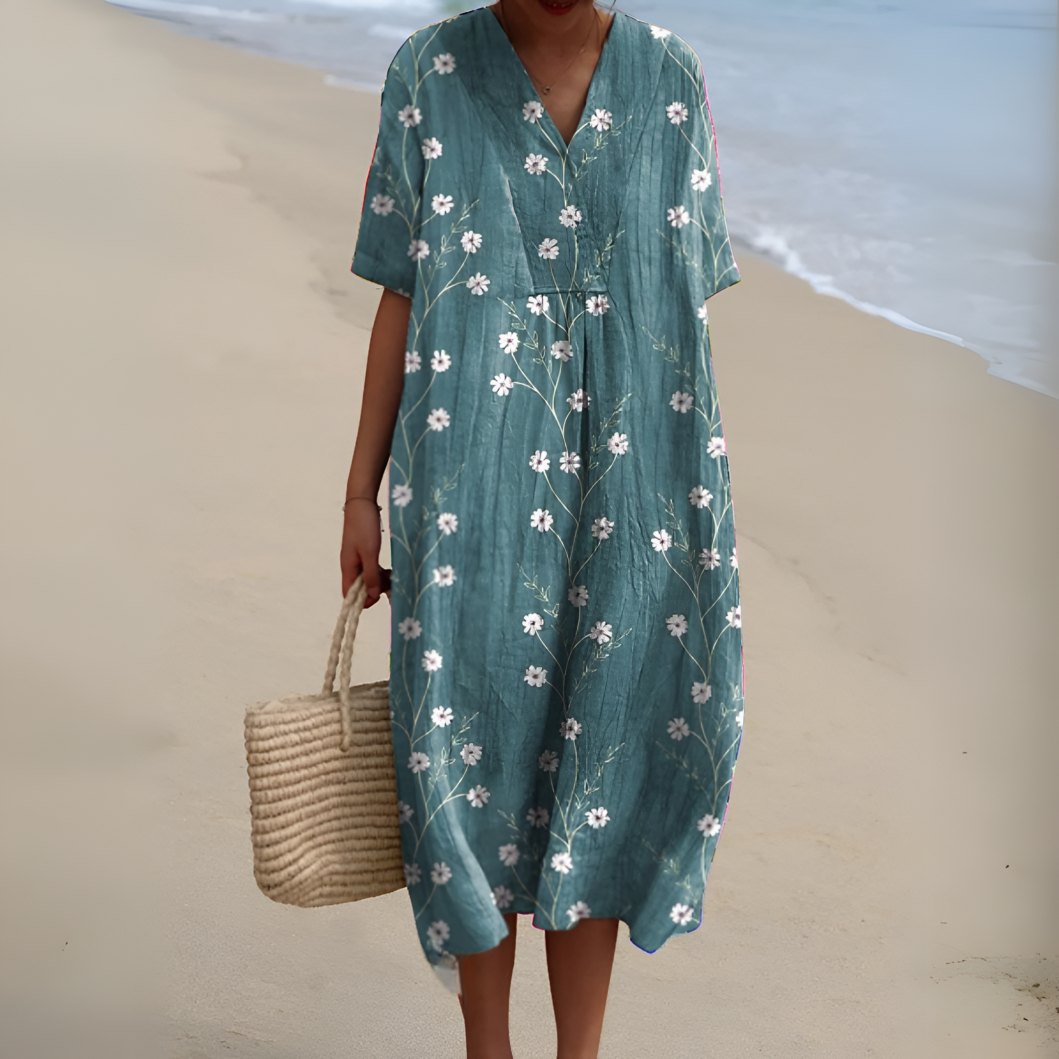 De Nicole™ | Zomerjurk met Bloemen straalt luchtigheid en vrouwelijkheid uit. De casual pasvorm, ademende stof en kleurrijke bloemenprint maken dit dé jurk voor zonnige dagen – van strandwandeling tot terrasbezoek.